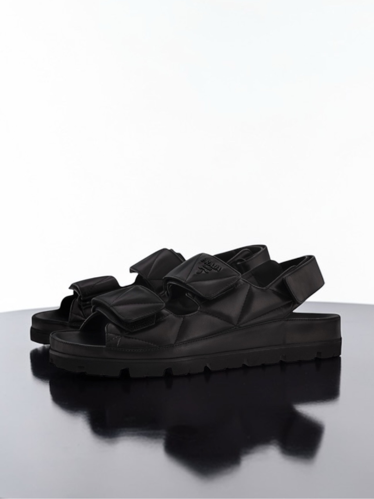 Сандалии Prada — это стильное решение для современных модниц. Широкая рельефная подошва обеспечивает комфорт при ходьбе, а стеганый дизайн добавляет изысканности внешнему виду обуви. Мягкая гладкая кожа с матовым блеском подчеркивает качество материала, а регулируемые ремешки позволяют идеально зафиксировать сандалию на ноге. Эти элегантные женские сандалии черного цвета выполнены из кожи и оснащены подошвой из резины, что гарантирует их долговечность и удобство использования.