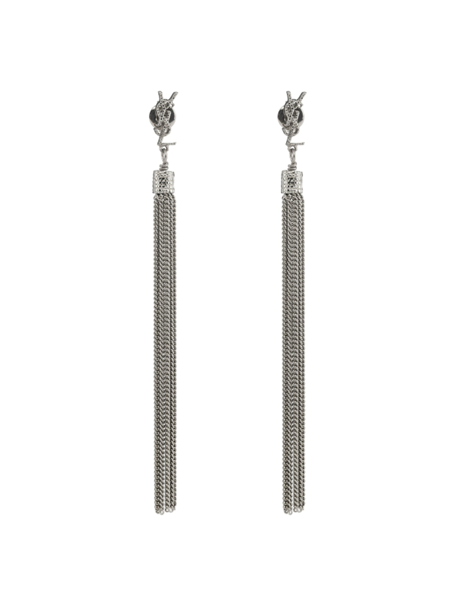 Серьги Saint Laurent - это сочетание изысканного стиля и высокого качества. Модель украшена монограммой YSL и кисточками, что придает ей особый шарм. Застежка-штифт обеспечивает надежность и удобство ношения. Изготовлены серьги из 100% латуни, материала, который отличается своей долговечностью и стойкостью к коррозии.