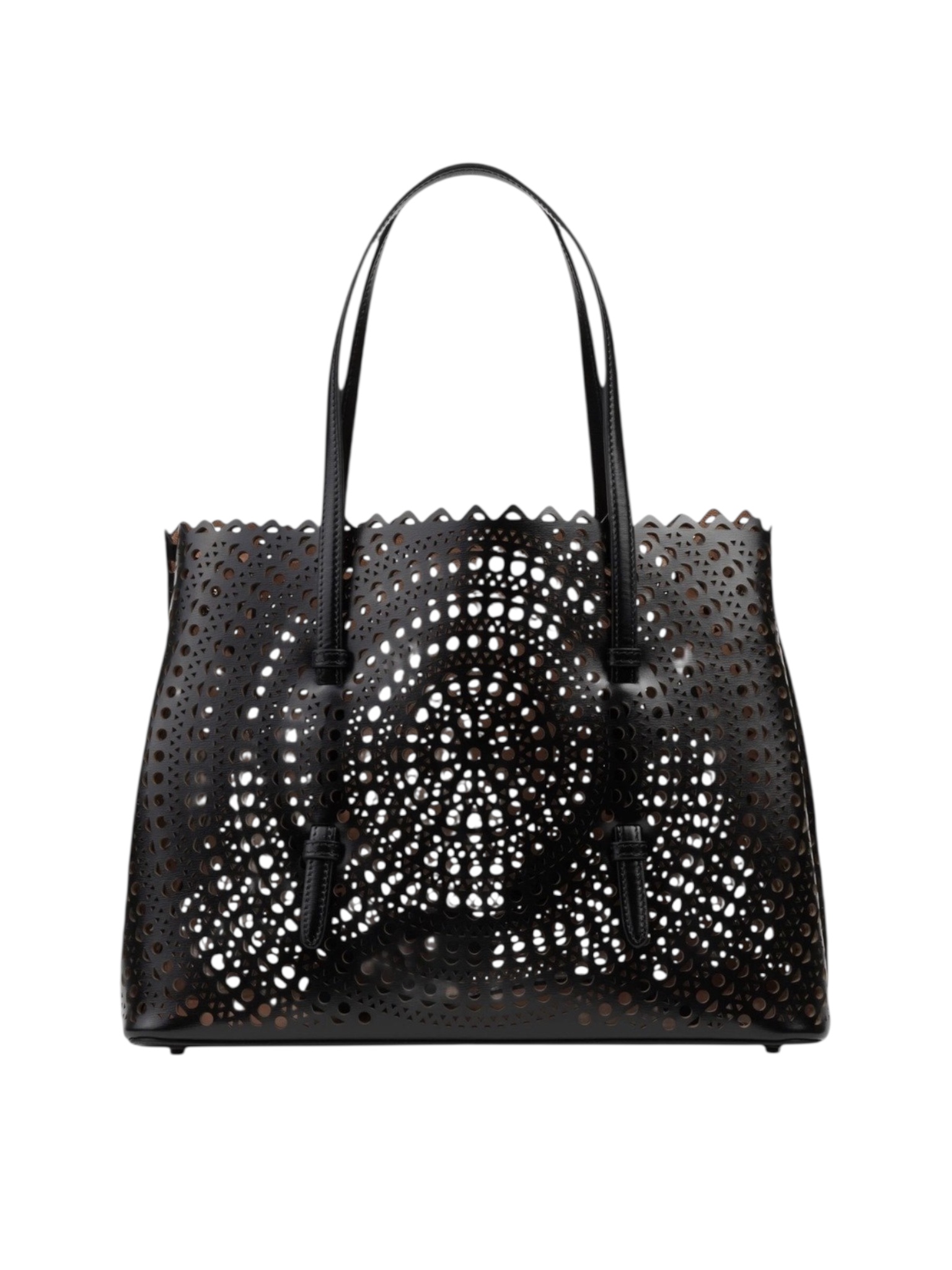 Сумка Alaïa - архитектурный шедевр в мире аксессуаров. Культовая модель от парижского дома сочетает в себе скульптурный дизайн и непревзойденное мастерство работы с кожей. Перфорированная версия сумки-тоут превращает базовый силуэт в настоящий объект искусства. Лазерная резка создает гипнотический круговой узор, играющий с восприятием объема и света. Этот экземпляр продолжает традицию Alaïa – превращать аксессуары в носимую архитектуру. Сумка демонстрирует идеальный баланс между новаторскими техниками и вечной элегантностью.