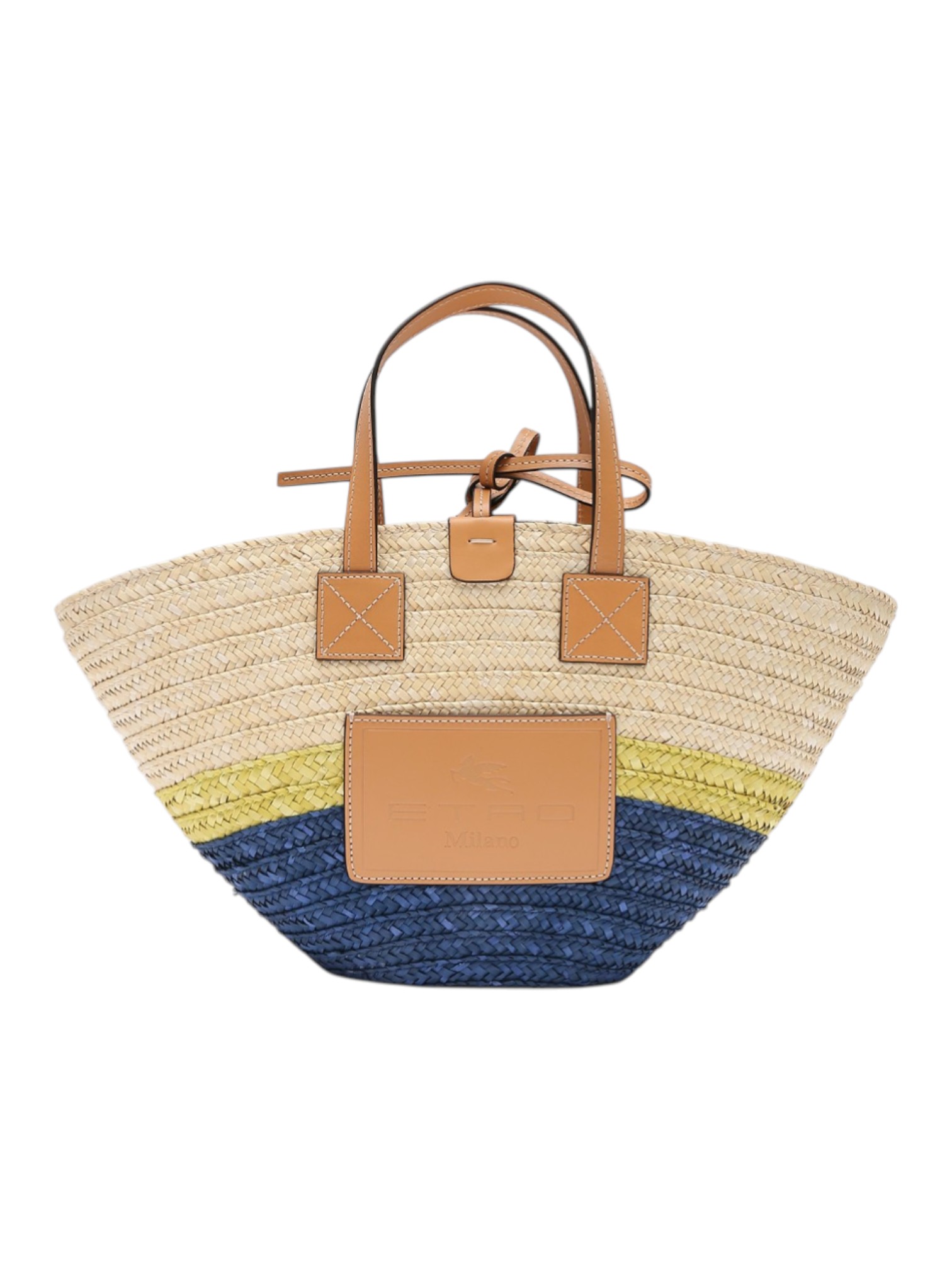 Сумка Etro - идеальный аксессуар для летнего сезона и городских прогулок. Модель выполнена из плетёной соломки с контрастными цветовыми полосами, которые придают образу свежесть и динамику. Натуральная фактура гармонично сочетается с кожаной отделкой и лаконичной фурнитурой. Жёсткие кожаные ручки обеспечивают комфортную носку, а декоративная кожаная вставка с тиснением логотипа подчёркивает премиальный характер изделия. Сумка вместительная и практичная - отлично подойдёт для повседневных выходов, поездок и отдыха.