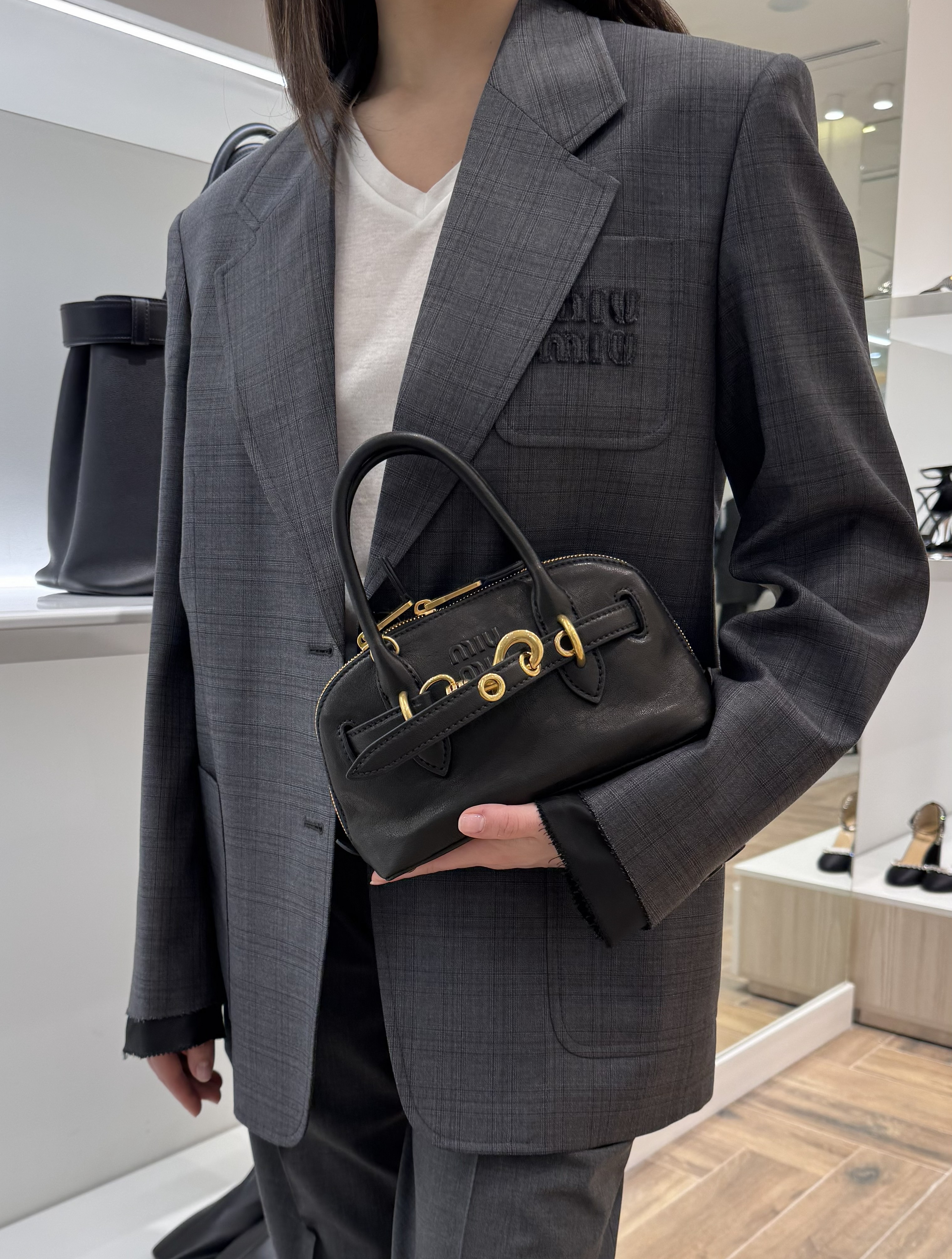 Сумка Miu Miu Nappa Aviato - это стильное и элегантное решение для современных модниц. Изготовлена из овечьей кожи, эта сумка станет отличным дополнением к вашему гардеробу. Благодаря регулируемому и съемному кожаному плечевому ремешку вы всегда сможете подобрать оптимальную длину под ваш рост и настроение. Кожаные ручки обеспечивают удобство при ношении, а старинная фурнитура с золотой отделкой добавляет особого шарма этой модели. Льняное внутреннее отделение оснащено двумя накладными карманами, что позволит вам удобно разместить все необходимые вещи. Застежка на молнии обеспечит безопасность ваших личных вещей во время использования.