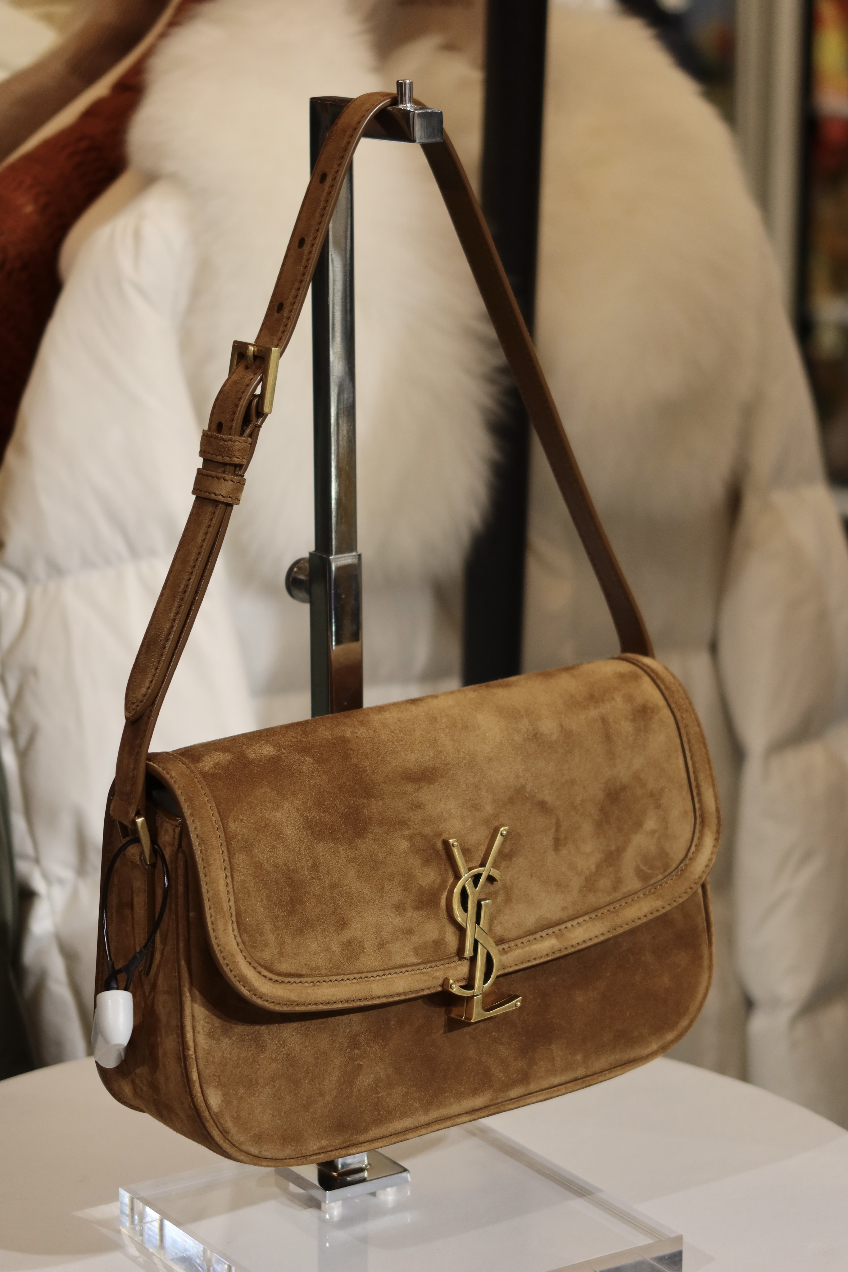 Сумка Saint Laurent - воплощает собой безупречное сочетание роскошной текстуры и фирменного бунтарского шика. Выполненная из 100% замши, она привлекает внимание благородной матовой фактурой, которая идеально контрастирует с сияющей золотистой фурнитурой. Удобная застежка на клапане обеспечивает безопасность содержимого и завершает лаконичный, структурированный силуэт сумки.