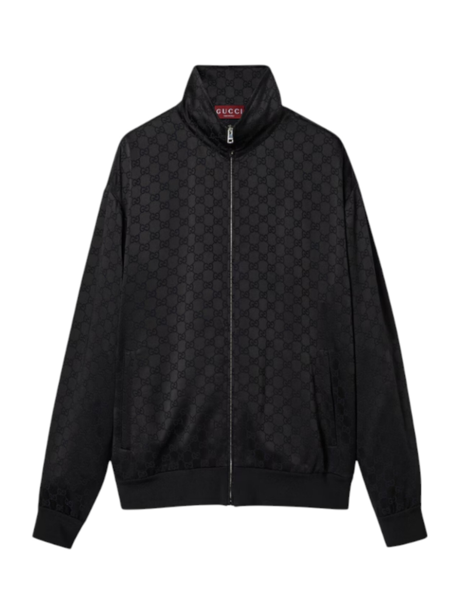Толстовка Gucci - сочетающая в себе современный крой и наследие бренда. Модель выполнена из 100% хлопка премиум-качества, обеспечивающего исключительный комфорт. Отличительной чертой является утонченный высокий воротник-стойка, создающий выразительный силуэт. Серебристая фирменная молния Gucci и два скрытых боковых кармана органично вписаны в дизайн. Главным акцентом становится культовый жаккардовый принт GG, выполненный в черной гамме - символ безупречного вкуса и узнаваемости.