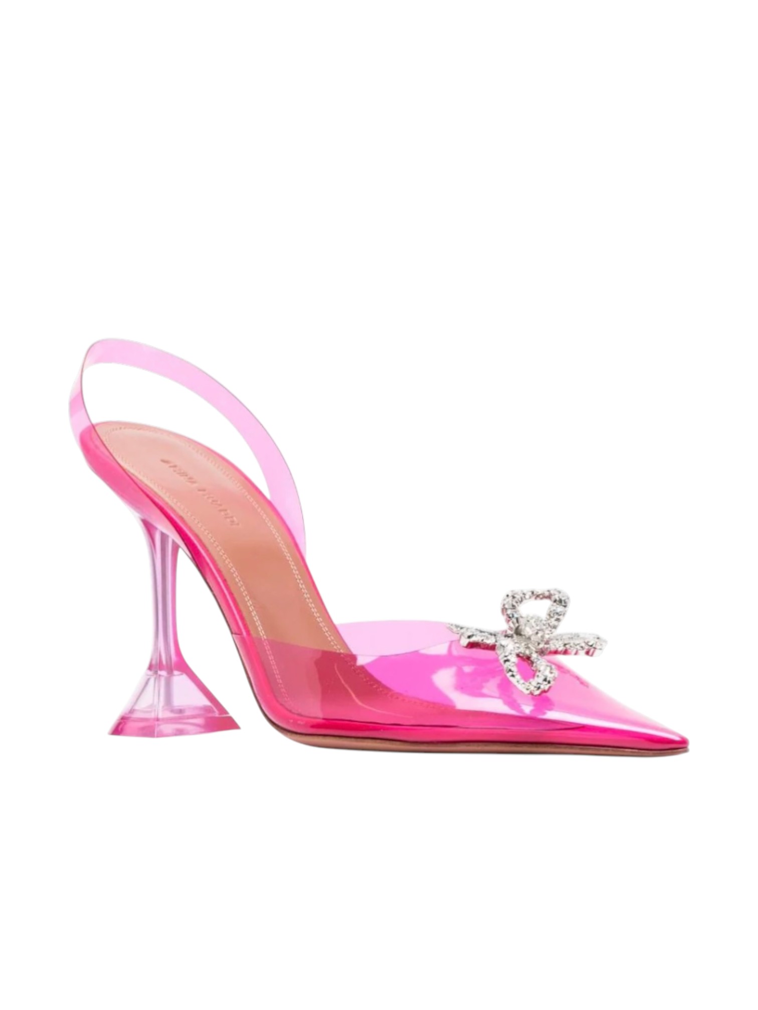 Туфли Amina Muaddi - это объекты желания для тех, кто понимает моду как искусство. Бренд, основанный румынским дизайнером, прославился своим узнаваемым архитектурным каблуком и безупречным чувством пропорций. В этой модели фирменная эстетика раскрывается через контраст строгой геометрии и игривой романтики. Высокий каблук и заостренный носок создают выразительную, удлиняющую ноги линию. Это идеальный баланс между смелостью и элегантностью.