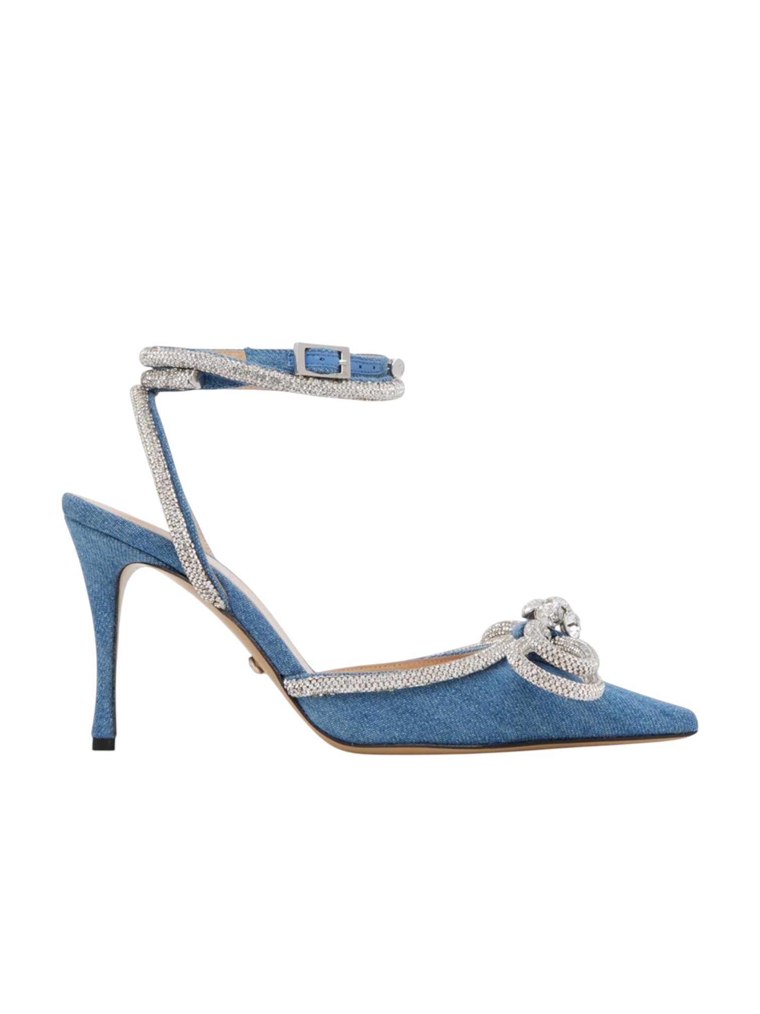 Туфли Mach & Mach - из денима с острым носом и акцентом на мыске. Двойной бант и ремешок на щиколотке с закрученной пряжкой усыпаны кристаллами. Шпилька с резиновыми вставками и графическая фурнитура на подошве подчеркивают уникальность. Логотип на стельке. Идеальное сочетание дерзости и гламура. Это не просто туфли - это смелое дизайнерское высказывание. Безупречный баланс элегантности, комфорта и технологичного дизайна.