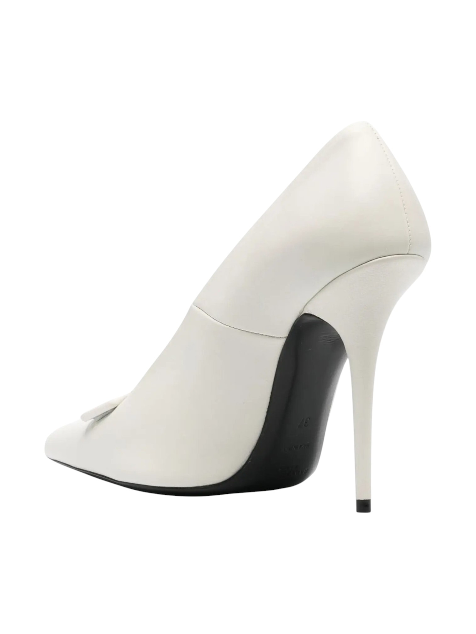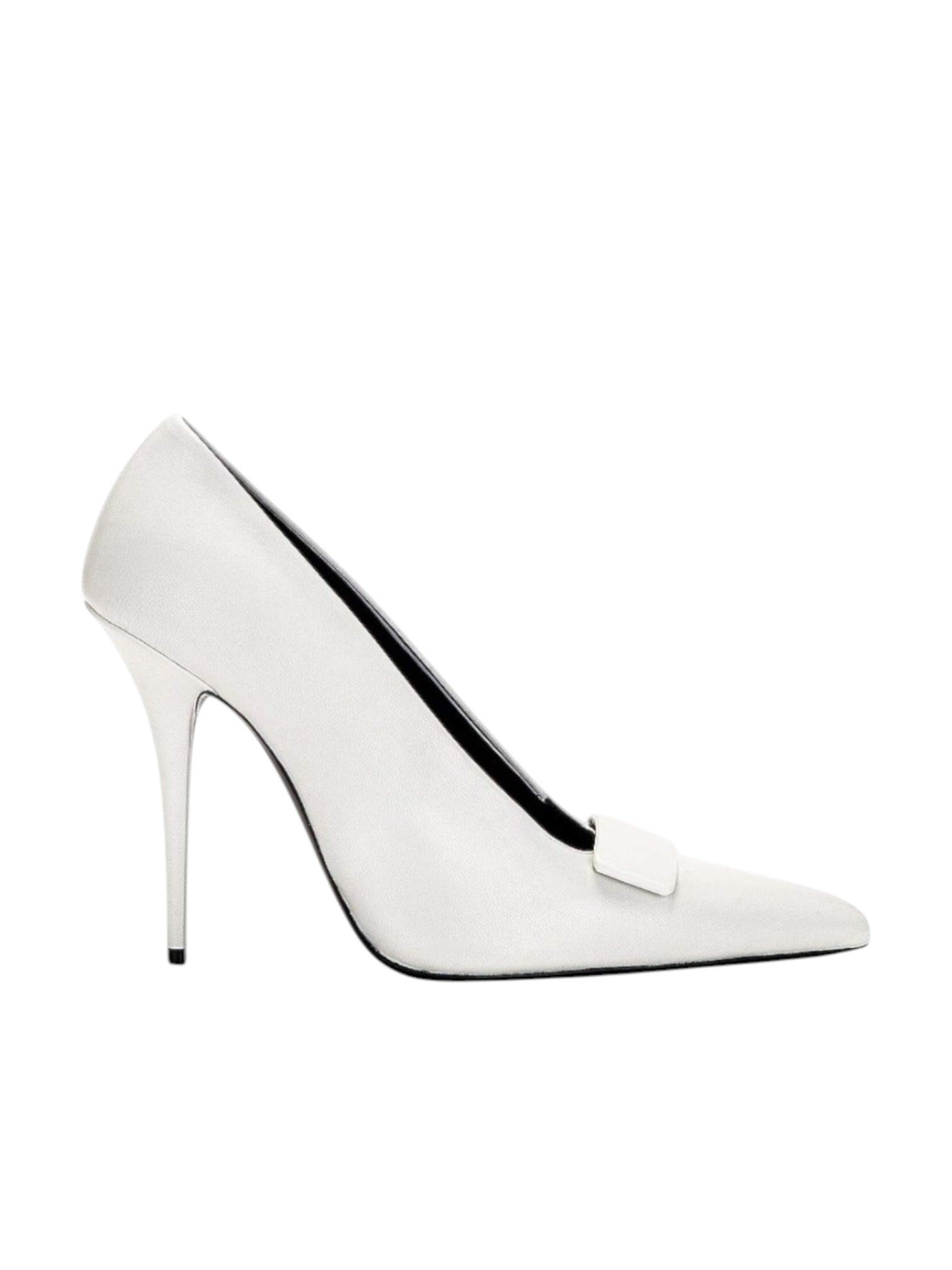 Туфли Saint Laurent - эти белые туфли, изготовленные из роскошной телячьей кожи, обладают гладкой текстурой. Декорированы изящной аппликацией. Отсутствие застежки придает им лаконичность. Заостренный носок подчеркивает элегантность. Кожаная стелька с логотипом свидетельствует о высоком качестве. Это выбор для тех, кто ценит уникальность, ручную работу и дерзкую элегантность.