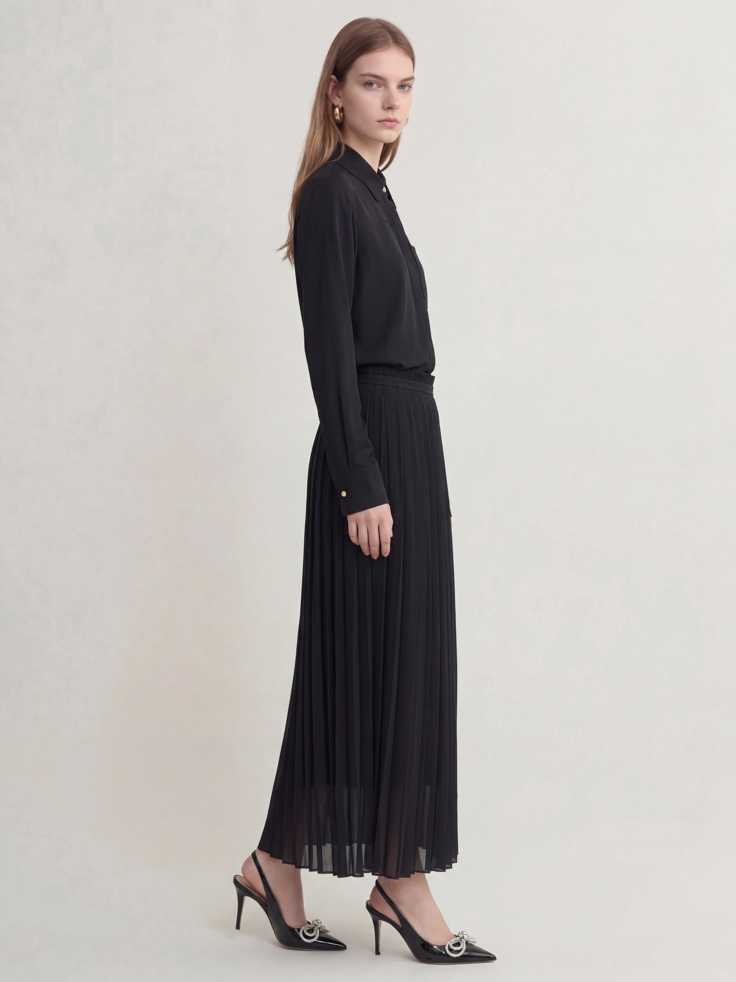 Юбка Ami - выполненная из качественного материала с тонкой плиссировкой. Модель глубокого черного цвета подчеркивает утонченность и универсальность. Высокая талия визуально удлиняет силуэт, а боковая застежка на пряжке добавляет стильный акцент. Боковой разрез обеспечивает свободу движений, а необработанный край придает образу легкую богемную небрежность. Эта юбка идеально сочетает в себе парижский шик и современный комфорт. Идеально для: офиса, вечерних мероприятий и повседневной носки, где важны элегантность, комфорт и парижский стиль.