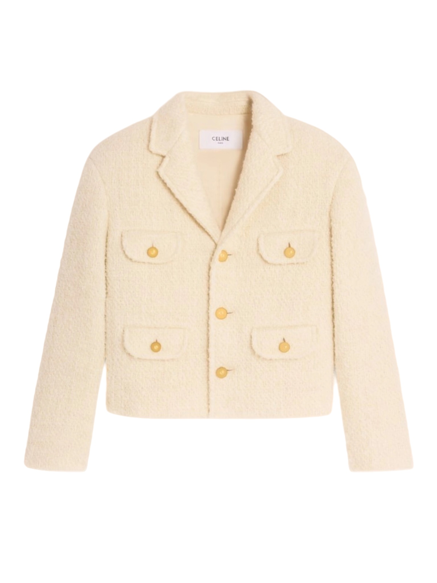 Жакет Celine - выполненный из текстурной буклированной ткани цвета слоновой кости. Элегантный крой с отложным воротником и застежкой на пуговицы создает утонченный образ. Четыре накладных кармана с клапанами добавляют функциональности и шарма. Золотистые пуговицы придают жакету нотку роскоши и завершают его стильный вид. Идеальный выбор для создания элегантных и запоминающихся образов.