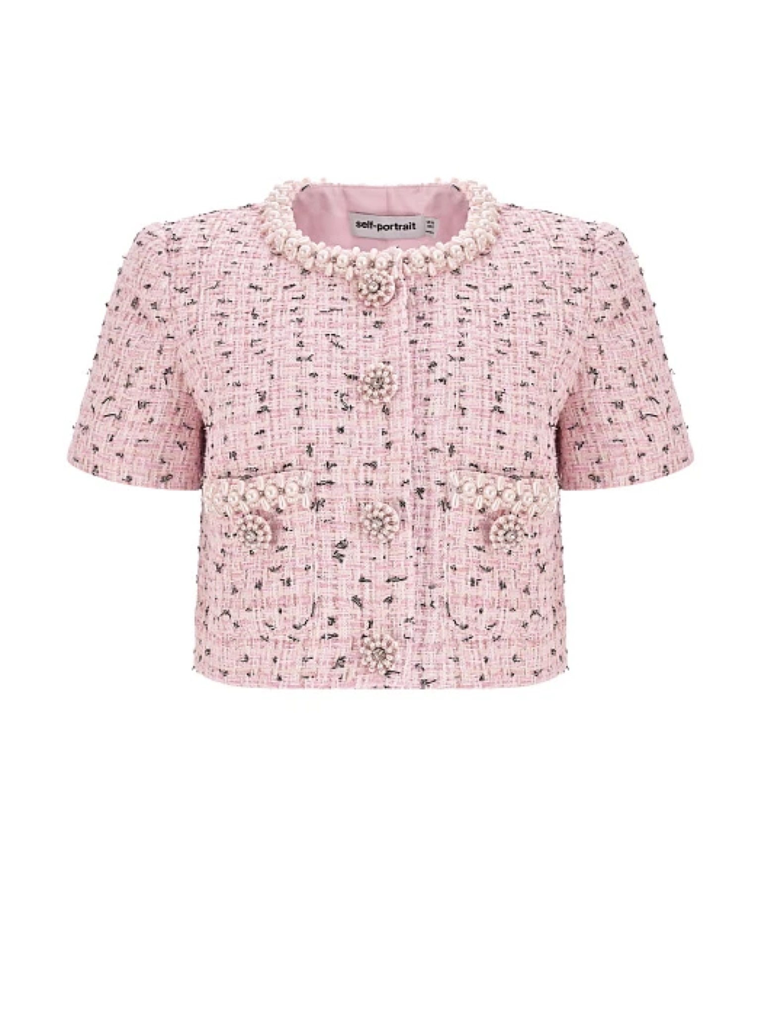 Жакет Self-Portrait - выполнен из розового твида с добавлением блестящих нитей, создающих изысканное мерцание. Модель с короткими рукавами и круглым вырезом горловины, украшенным декоративной отделкой из жемчужин. Жемчужные пуговицы с кристаллами придают образу утончённый, женственный акцент. Накладные карманы подчёркивают классический силуэт в духе ретро-шика. Этот жакет идеально сочетается как с юбкой, так и с джинсами, добавляя любому образу нотку элегантности и роскоши.