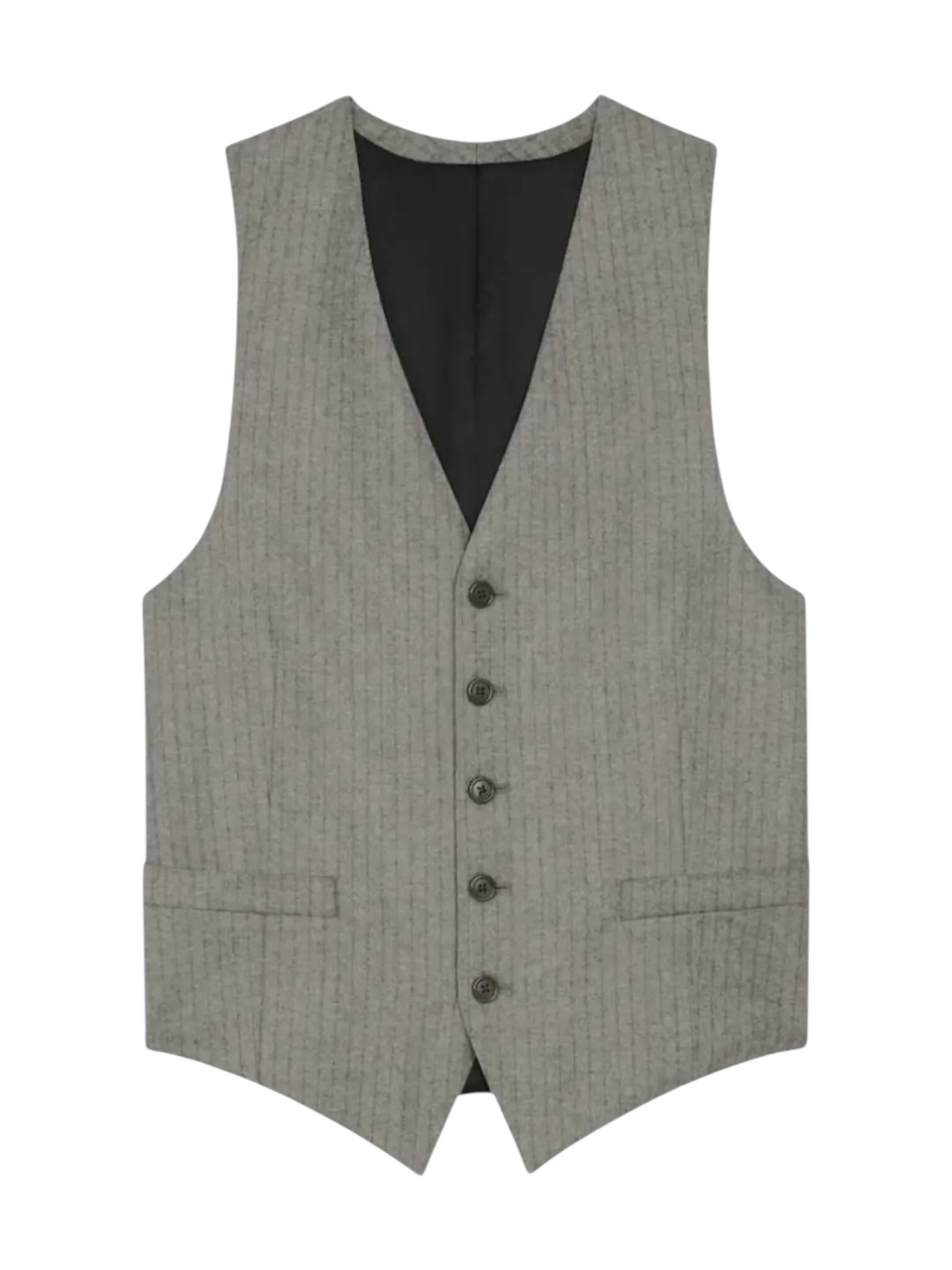 Жилет Celine - выполненный в сдержанном сером оттенке. Модель отличается утонченным кроем без рукавов и классическим V-образным вырезом, который создает строгий и одновременно женственный силуэт. Застежка на пуговицы добавляет лаконичности и завершенности дизайну. Идеальный вариант для многослойных образов, этот жилет подчеркивает минималистичную эстетику бренда и внимание к деталям. Сдержанный цвет и универсальный крой делают его практичным элементом гардероба.