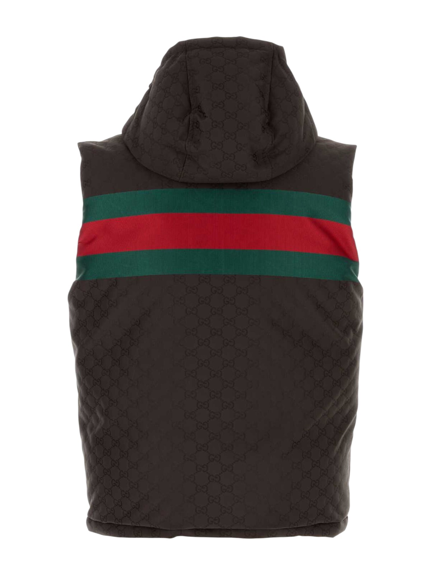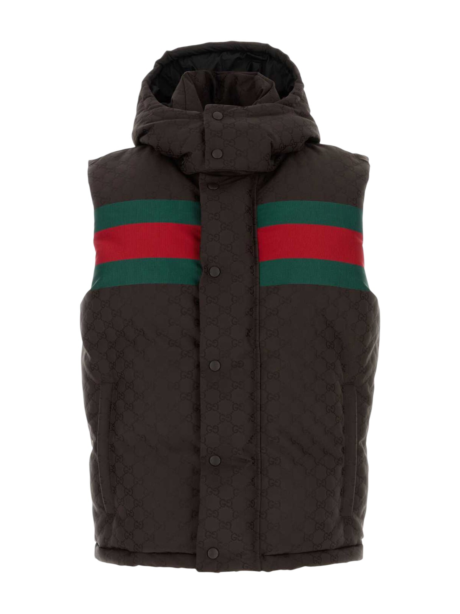 Жилет Gucci - созданный из культового холста GG в фирменной цветовой гамме: коричневый, темно-зеленый и ярко-красный. Модель сочетает в себе традиционное стеганое исполнение и современный дизайн. Универсальный крой без рукавов подчеркивает легкость и функциональность, а застежка на кнопках спереди обеспечивает удобство использования. Элегантный капюшон-стойка создает выразительный силуэт, а два боковых прорезных кармана добавляют практичности. Фирменная отделка и прямой подол завершают образ, подчеркивая наследие бренда и внимание к деталям.