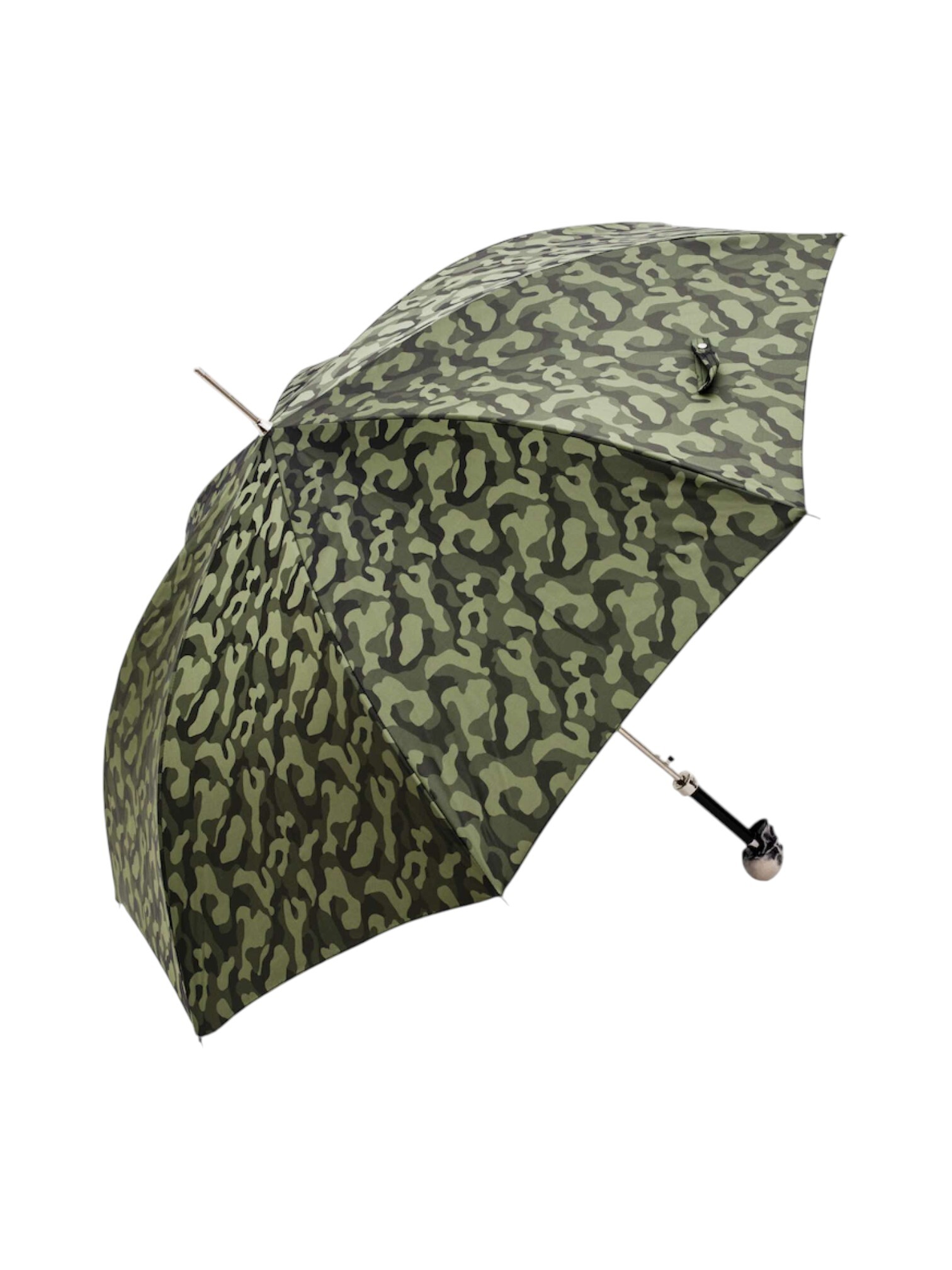 Зонт Pasotti - с дизайнерской ручкой в виде черепа - для тех, кто видит в дожде возможность проявить свой уникальный стиль и бескомпромиссный характер. Центром притяжения стала уникальная ручка, выполненная в форме искусно проработанного черепа. Каждая деталь - это тактильное наслаждение и свидетельство высокого искусства итальянского дизайна. Этот элемент в готическом или милитари-стиле дерзко контрастирует с классическим камуфляжным рисунком купола, создавая мощный визуальный образ. Просторный купол диаметром 110 см, изготовленный из 100% полиэстера, обеспечивает максимальную защиту от дождя. Этот зонт - идеальный спутник для смелых урбанистов, ценящих искусство, функциональность и внимание к деталям.